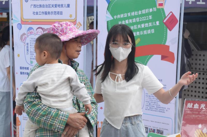 本次活动分两场举行,分别在10月27日和11月3日上午。在社工党支部教师和阳光雨露社工的带领下,2076班社会工作专业的学生志愿者们在南宁市武鸣区文化广场开展活动,通过向武鸣居民普及地贫防治知识,营造全社会关爱地贫儿童的良好氛围。