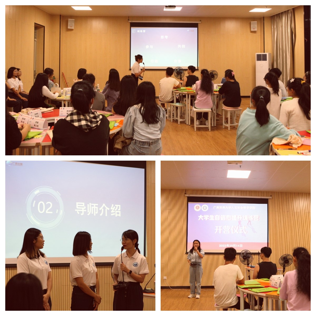 本次训练营为期8周,共10个主题课程内容,以大学生自我探索为主,通过主题授课、徒步拓展、朋辈沙龙、演说展示、读书会等多种形式,整合校内外资源,为学生们规划统筹搭建自信心建设、成长平台,旨在帮助大学生提高自信心和心理健康水平,提升他们在日常生活、学习、工作的自尊自信度,促进其自我成长。
