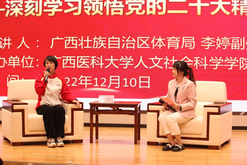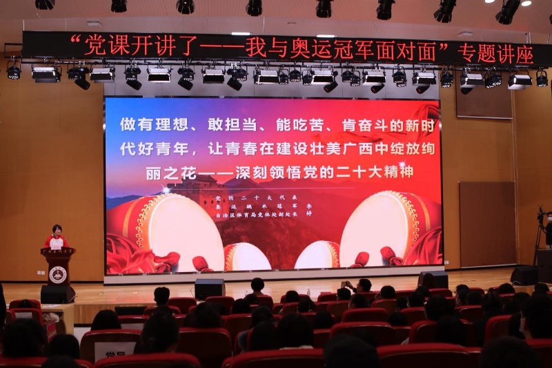 为深入学习宣传贯彻党的二十大精神,领悟习近平总书记关于青年工作的重要思想,2022年12月10日晚,拷贝漫画 在武鸣校区图书馆报告厅举办了“党课开讲啦——我与奥运冠军面对面”专题报告会。邀请二十大代表、奥运冠军、广西壮族自治区体育局竞体处李婷副处长为我党员、团员师生宣讲“做有理想、敢担当、能吃苦、肯奋斗的新时代好青年,让青春在建设壮美广西中绽放绚丽之花——深刻学习领悟党的二十大精神”主题报告。报告通过线下学习+线上直播的方式开展,由拷贝漫画 党委书记唐忠主持。