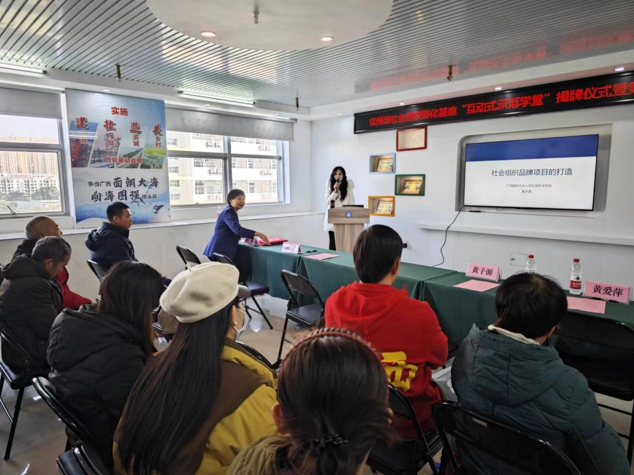 与钦州市社会组织孵化基地在钦州市民政局举行“互动式示范学堂”揭牌仪式。出席本次揭牌仪式的有学院党委书记唐忠,社工系专任教师黄子源,钦州市民政局局长吴超,钦州市社会组织孵化基地运营负责人黄敏、市义工联合会等社会组织骨干代表。