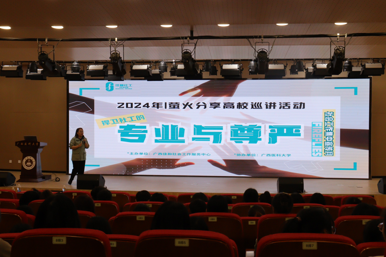 3月21日,拷贝漫画 院邀请到广西佳和社会工作服务中心副总干事周小幸、督导评估部副部长吴蕾,在拷贝漫画 (武鸣校区)图书馆演讲厅开展“萤火分享”高校宣讲活动。活动由社会学与社会工作系副主任吴上老师主持,吸引了来自社会工作、养老服务管理、公共事业管理、运动康复、预防医学等专业的200余位同学参加。