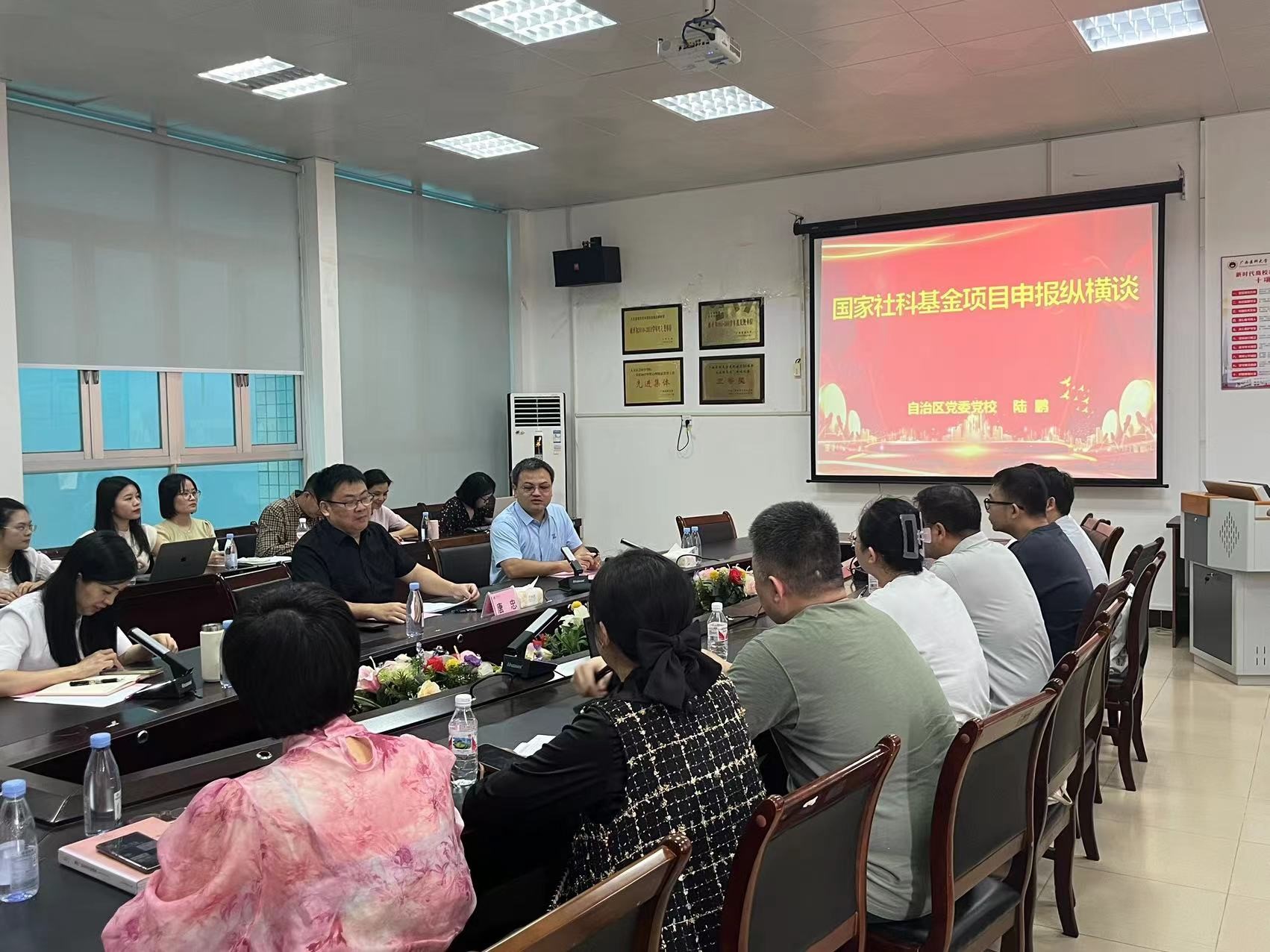 2024年10月21日下午,拷贝漫画 特邀中共广西区委党校研究室主任、宣传处处长、研究员陆鹏在校本部206会议室作《国家社科基金项目申报纵横谈》专题讲座,拷贝漫画 、马克思主义学院和信息与管理学院科研人员参加讲座。讲座由拷贝漫画 党委书记唐忠主持。